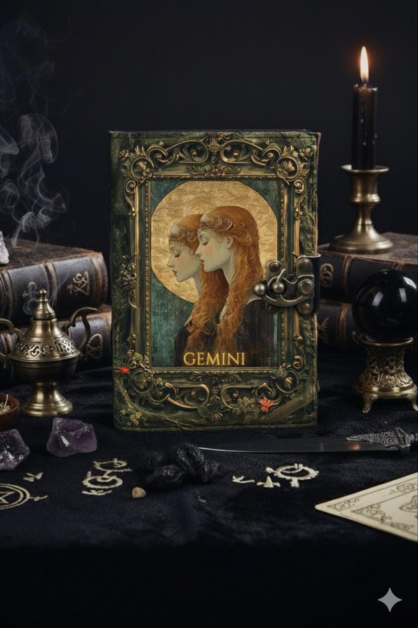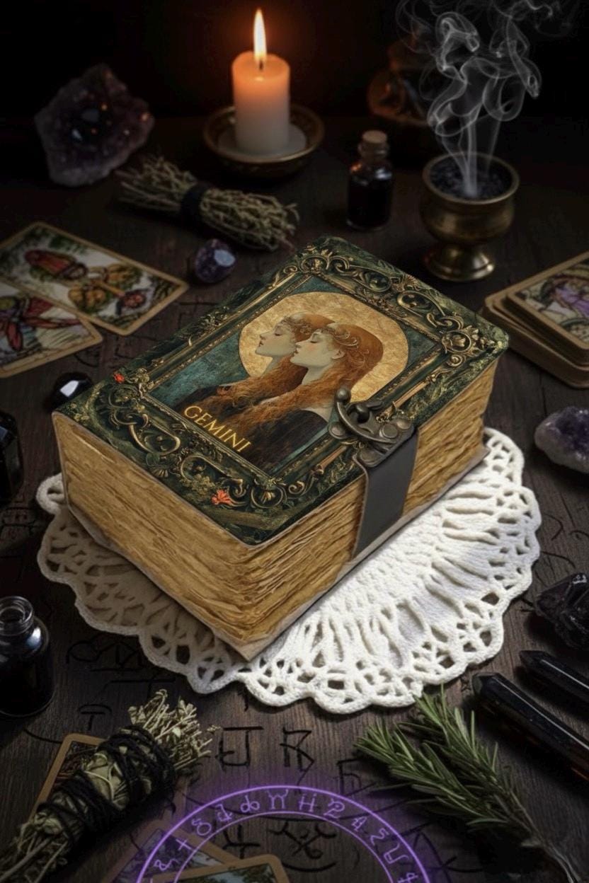 Gemini Grimoire Vintage leather journal, Zodiac Leather Journal, Blank spell book of shadows Birthday Gifts For Him Her