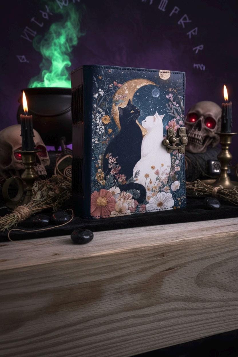 Grimoire leather journal, Print Cat Journal, Blank spell book book of shadows Leather Celestial Gifts For Him Her