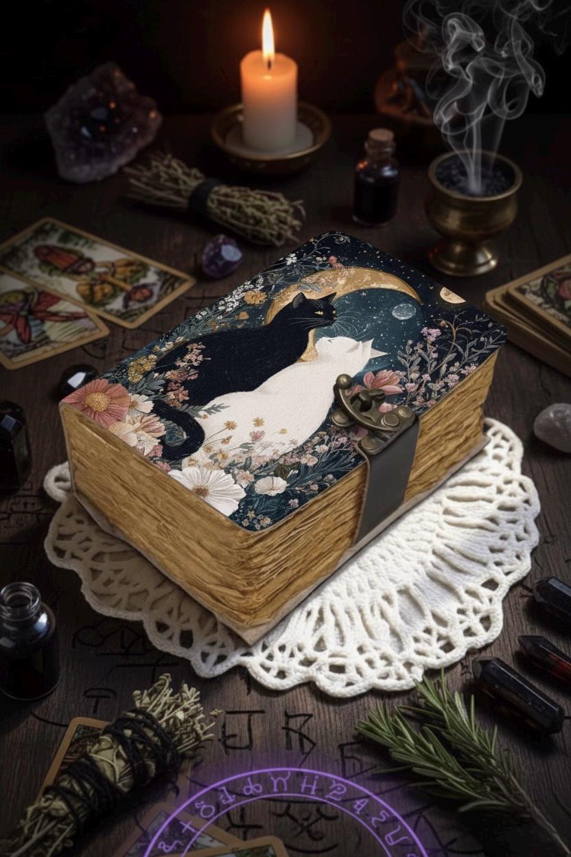 Grimoire leather cat journal, Blank spell book book of shadows Leather Celestial Gifts For Him Her * Print - Cat Journal * Vintage lock closure * Genuine buffalo leather * Vintage deckle edge old paper * handmade rustic cotton paper * 100 Sheet (200 pages both side) ●Leather journal witchcraft book of shadows notebook is made with 200 pages of Antique Paper which looks like it was pulled from history. You will fall in love with the the antique handmade cotton paper which is unique to our Vintage Journal Notebook. ● The vintage clasp lock will keep all your valuable writing locked inside.Sturdy hand stitched binding to make sure that no paper comes out loose from your spell notebook. ● The witchcraft supplies journal is printed with a special seven stone called “Chakra healing” which helps to reveal inner truth within yourself and encourage self-awareness and self expression. We have taken extra to make sure that the emboss is perfect in every piece. ● Sketch, Doodle, Write on your Leather Blank Spell Journal with a Calligraphy Pen Fountain Pen, Brush Pen, Ball Pen, Acrylic Colours, Watercolor and many more. We guarantee no bleed through. ● Can be used as a notepad, journal, writing notebook, sketch book. 1.25 inch thickness, easy for handwriting, drawing or sketching and compact for carrying in your bag. Ideal for alternative ● Artist Sketchbooks, Photo Album, Traveling Notes, Business Executive, Logbook, Poetry Work, Journalists, Food Planner, Instagram Scrapbook and Bible Journaling. ● Best Gift For Your Companion: A Journal Is Like A Trusted Friend. You Can Use It To Solve Queries, Get Inventive, Or Record Valuable Memories For Them To Last Forever Or You Can Just Use It As A Gift For Your Wife, Son, Or A Daughter Or For Some Enthusiastic Writer In Your Family. Even For Looking For A Miraculous Spell Book Or A D&D Gamer Looking For His Quest Book. ● Perfectly Sized For Multi-Purpose Use: Length 5", Width 1", Height 7" Inches, This Easy To Carry Personal Diary Is Perfect To Use As A Health Journal, Sketchbook, And Poetry Journal. It’S An Ideal Journal Which Records Your Daily Thoughts And Life Lists. And Also Good For Designing, Doodling, Or Calligraphy Of Your Choice.