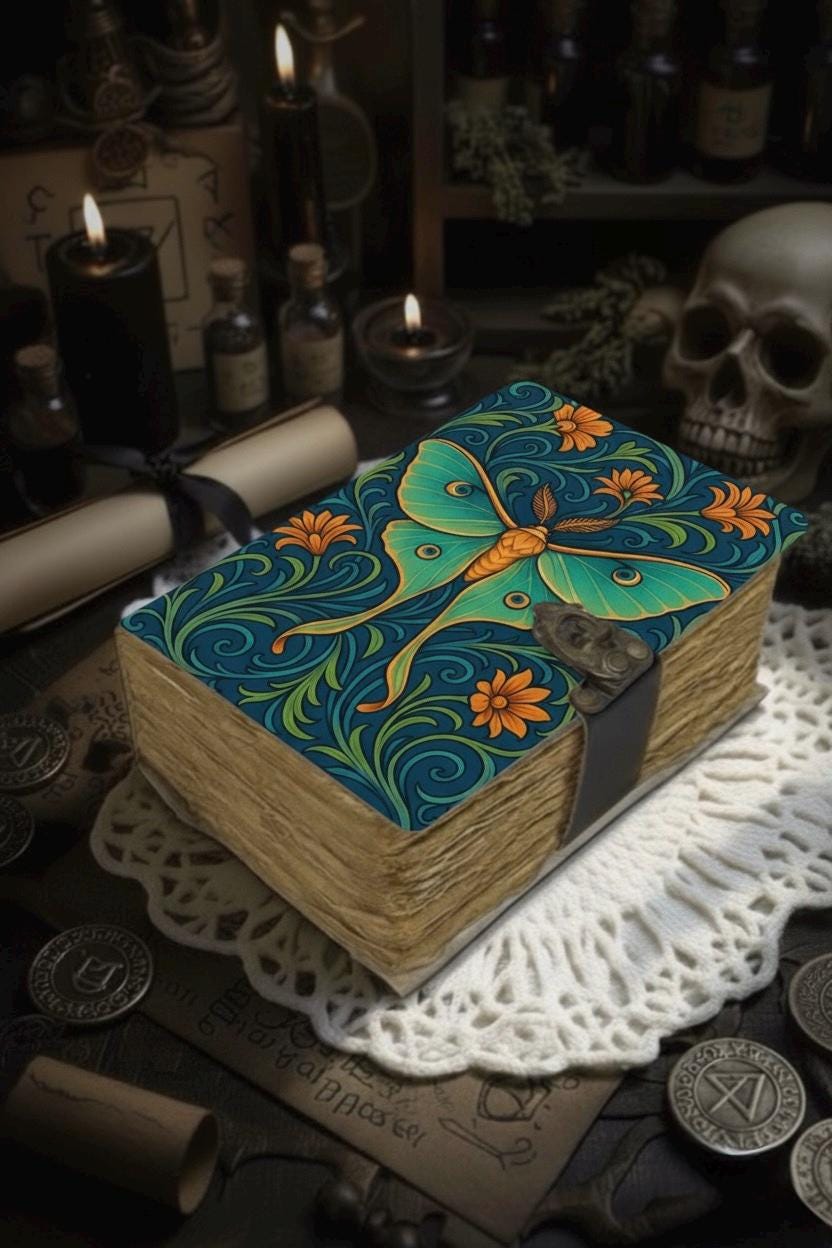 Luna Moth Grimoire – Handmade Luna Spell Book of Shadows Personalized Wiccan Leather Journal with Deckle Pages | Witchy Gift