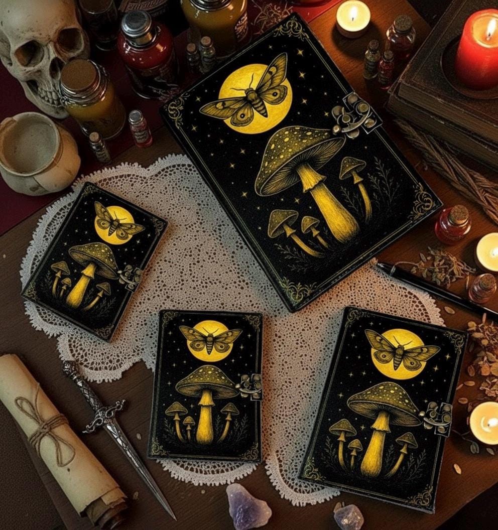 Mushroom Leather Journal, Moon Grimoire Notebook, Witchcraft Book Spell Book of Shadows Gifts for Women • Print - Fairy Moon mushroom • Vintage lock closure • Genuine leather • Vintage deckle edge old paper • handmade rustic cotton paper • 100 Sheet (200 pages both side) • 200 Sheet (400 pages both side) ●Leather journal witchcraft book of shadows notebook is made with 200 pages of Antique Paper which looks like it was pulled from history. You will fall in love with the the antique handmade cotton paper which is unique to our Vintage Journal Notebook. ● The vintage clasp lock will keep all your valuable writing locked inside.Sturdy hand stitched binding to make sure that no paper comes out loose from your spell notebook. ● This magical mushroom journal is adorned with a vibrant red toadstool forest under a glowing moon — a symbol of transformation, growth, and mystery. It invites you to explore your imagination, embrace nature’s wisdom, and uncover the hidden stories within your soul. Each piece is carefully crafted to ensure the artwork feels alive and enchanting. ● Sketch, Doodle, Write on your Leather Blank Spell Journal with a Calligraphy Pen Fountain Pen, Brush Pen, Ball Pen, Acrylic Colors, Watercolor and many more. We guarantee no bleed through. ● Can be used as a notepad, journal, writing notebook, sketch book. 1.25 inch thickness, easy for handwriting, drawing or sketching and compact for carrying in your bag. Ideal for alternative ● Artist Sketchbooks, Photo Album, Traveling Notes, Business Executive, Logbook, Poetry Work, Journalists, Food Planner, Instagram Scrapbook and Bible Journaling. ● Best Gift For Your Companion: A Journal Is Like A Trusted Friend. You Can Use It To Solve Queries, Get Inventive, Or Record Valuable Memories For Them To Last Forever Or You Can Just Use It As A Gift For Your Wife, Son, Or A Daughter Or For Some Enthusiastic Writer In Your Family. Even For Looking For A Miraculous spell book Or A D&D Gamer Looking For His Quest Book. ● Perfectly Sized For Multi-Purpose Use: Length 5", Width 1", Height 7" Inches, This Easy To Carry Personal Diary Is Perfect To Use As A Health Journal, Sketchbook, And Poetry Journal. It’S An Ideal Journal Which Records Your Daily Thoughts And Life Lists. And Also Good For Designing, Doodling, Or Calligraphy Of Your Choice. Why Choose Heritage Stitch Art ? At Heritage Stitch Art , we believe in the magic of handmade artistry. Every journal we create is a unique blend of tradition, creativity, and soulful design. Here's why our customers love us: ✔️ Authentic Handcrafted Designs – Each piece is handmade with care by skilled artisans in India, using time-honored techniques. ✔️ Premium Quality Leather & Paper – We use genuine leather and eco-friendly, deckle-edge cotton paper to give your journal a timeless feel. ✔️ Meaningful Themes – From mystical mushrooms to moonlit forests, our designs are full of symbolism and storytelling. ✔️ Perfect for Gifting – Beautifully packaged and made with intention — ideal for birthdays, spiritual seekers, writers, and collectors. ✔️ Trusted by Thousands – With hundreds of 5-star reviews, we're proud to be part of your creative and spiritual journey. Let your thoughts, spells, dreams, or sketches come to life — only with Heritage Stitch Art .