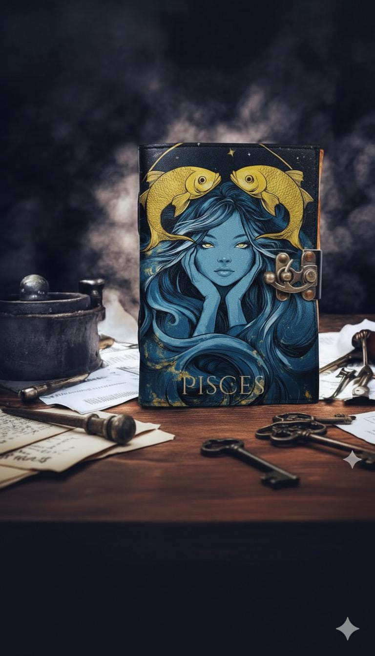 Pisces Grimoire Vintage leather journal, Zodiac Leather Journal, Blank spell book of shadows Birthday Gifts For Him Her