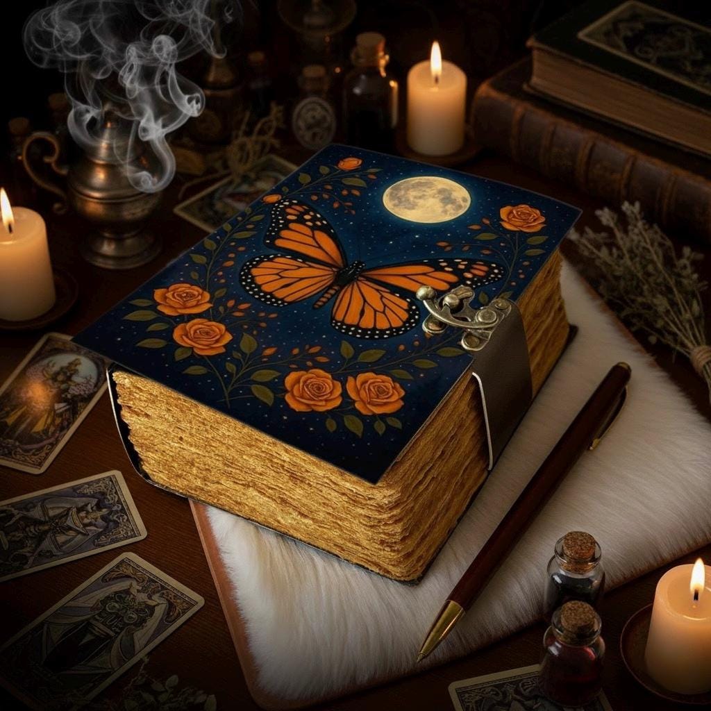 Luna Moth Moon Grimoire Vintage leather journal, Moon Leather Journal, Blank spell book of shadows Halloween Gifts For Him Her • Print - Moon Phase • Vintage lock closure • Genuine buffalo leather • Vintage deckle edge old paper • handmade rustic cotton paper • 100 Sheet (200 pages both side) ●leather journal witchcraft book of shadows notebook is made with 200 pages of Antique Paper which looks like it was pulled from history. You will fall in love with the the antique handmade cotton paper which is unique to our vintage journal Notebook. ● The vintage clasp lock will keep all your valuable writing locked inside.Sturdy hand stitched binding to make sure that no paper comes out loose from your spell notebook. ● variations is printed with a special seven stone called “Chakra healing” which helps to reveal inner truth within yourself and encourage self-awareness and self expression. We have taken extra to make sure that the emboss is perfect in every piece. ● Sketch, Doodle, Write on your Leather Blank Spell Journal with a Calligraphy Pen Fountain Pen, Brush Pen, Ball Pen, Acrylic Colours, Watercolor and many more. We guarantee no bleed through. ● Can be used as a notepad, journal, writing notebook, sketch book. 1.25 inch thickness, easy for handwriting, drawing or sketching and compact for carrying in your bag. Ideal for alternative ● Artist Sketchbooks, Photo Album, Traveling Notes, Business Executive, Logbook, Poetry Work, Journalists, Food Planner, Instagram Scrapbook and Bible Journaling. ● Best Gift For Your Companion: A Journal Is Like A Trusted Friend. You Can Use It To Solve Queries, Get Inventive, Or Record Valuable Memories For Them To Last Forever Or You Can Just Use It As A Gift For Your Wife, Son, Or A Daughter Or For Some Enthusiastic Writer In Your Family. Even For Looking For A Miraculous spell book Or A D&D Gamer Looking For His Quest Book. ● Perfectly Sized For Multi-Purpose Use: Length 5", Width 1", Height 7" Inches, This Easy To Carry Personal Diary Is Perfect To Use As A Health Journal, Sketchbook, And Poetry Journal. It’S An Ideal Journal Which Records Your Daily Thoughts And Life Lists. And Also Good For Designing, Doodling, Or Calligraphy Of Your Choice. Moon Journal Moon Book Sun Moon Book of shadows