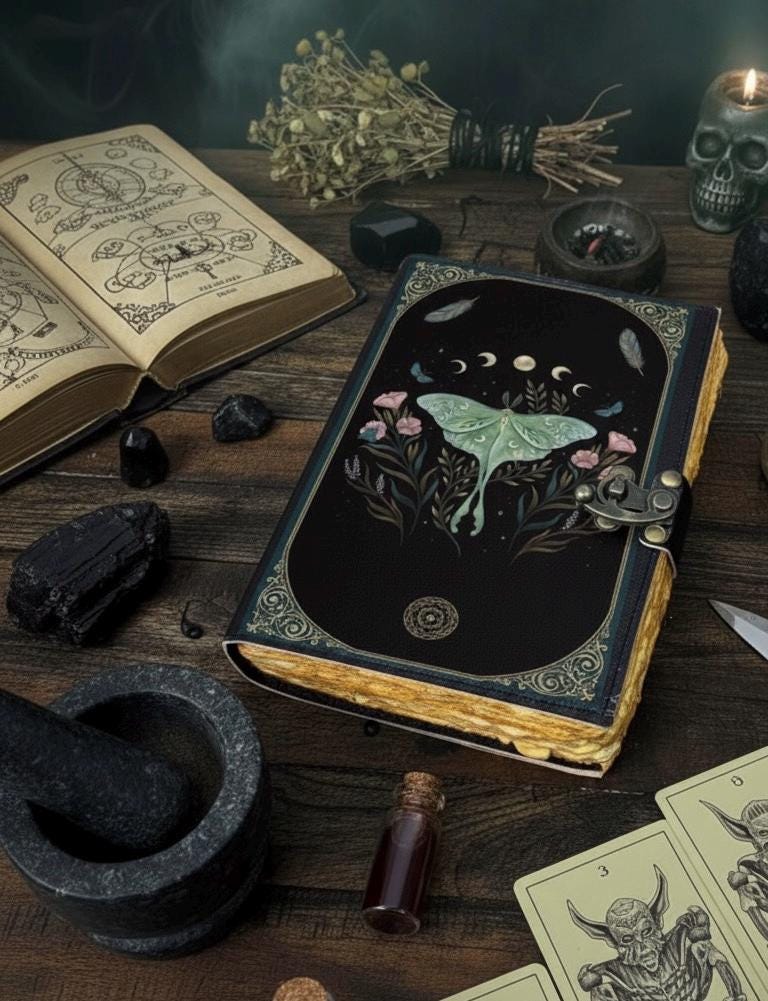 Crafted from genuine buffalo leather, with Luna Moth & chakra-stone embossing, and vintage deckle-edge handmade paper, this grimoire radiates transformation, rebirth, and timeless gothic beauty.