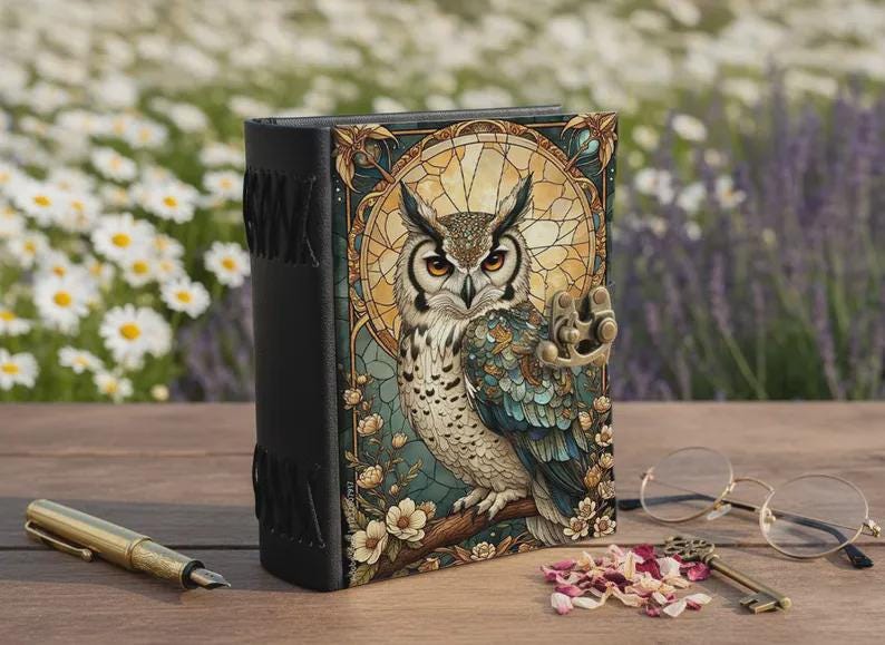 Owl leather journal, Celestial Grimoire Book, Witchcore Spell Book, Handmade Owl Notebook, Tarot Journal for Night Rituals, Forest Witch Diary, Custom Engraved Grimoire, Moon Magic Journal, Dark Academia Writing Book, Nocturnal Spell Book, Witchy Gift for Her or Him