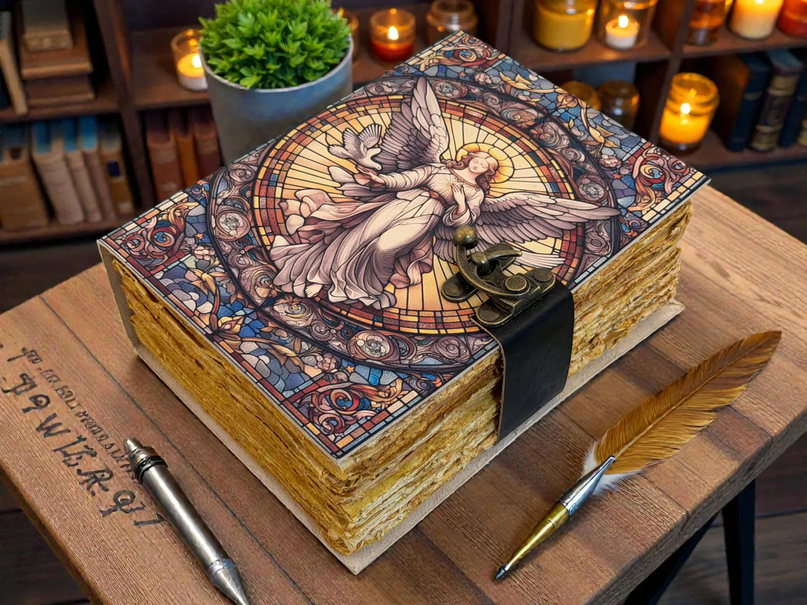 Angel Leather Grimoire Journal - Archangel Prayer & Spiritual Notebook - Handmade Antique Deckle Paper