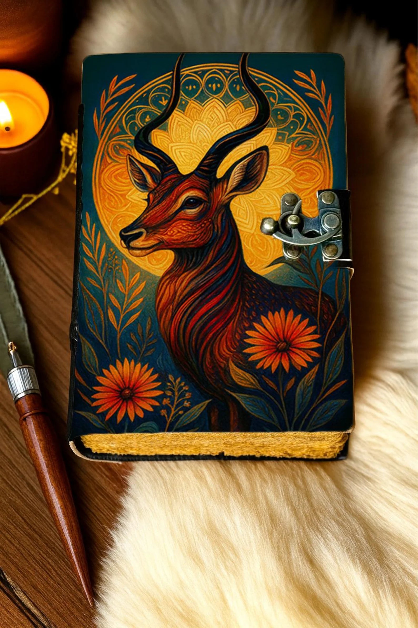 Deer Leather Journal Handmade Embossed Stag Notebook with Lock Forest Wildlife Grimoire Diary Rustic Nature Sketchbook Gift for Men & Women