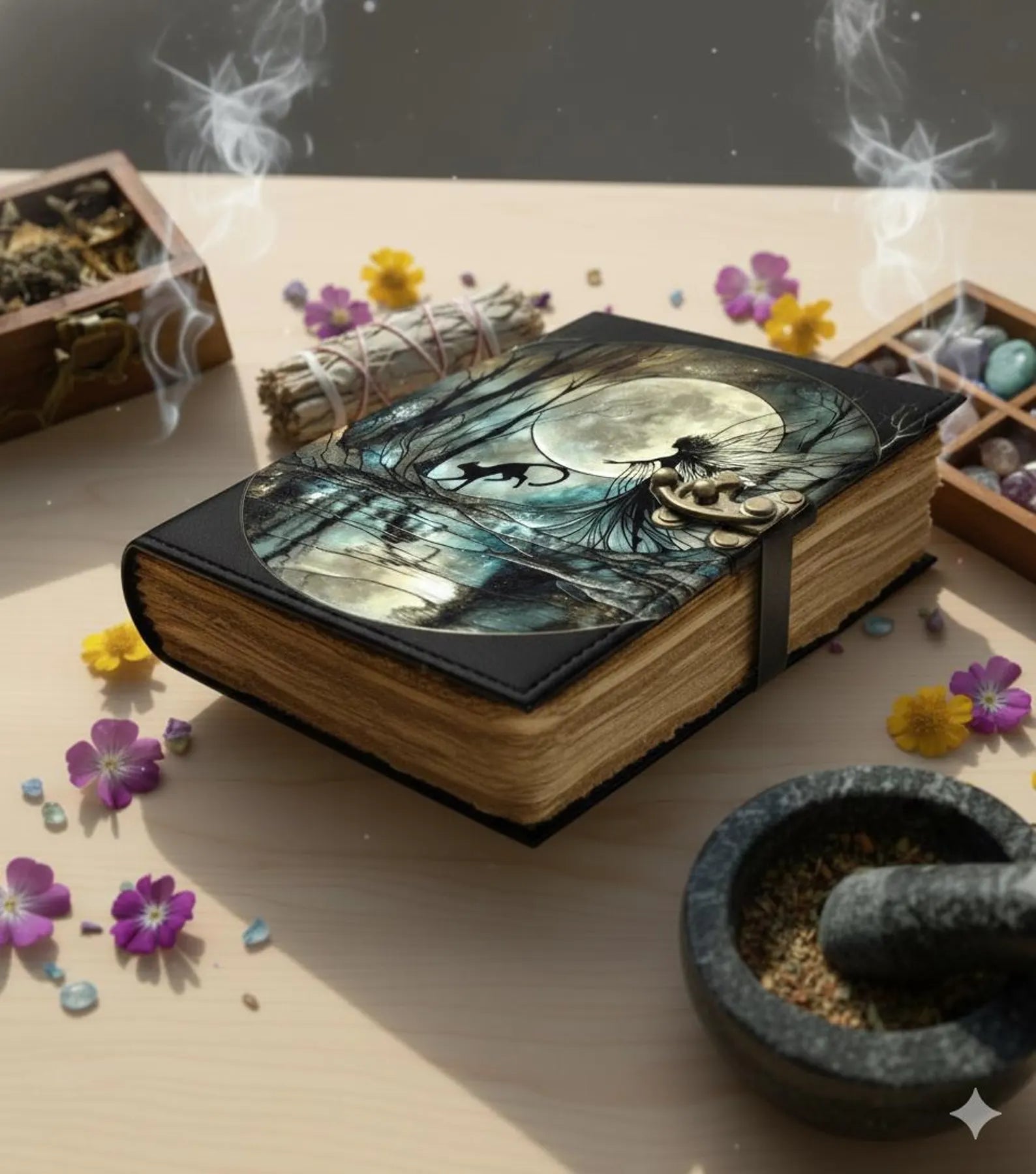 Leather Grimoire Journal: Cat With Fairy Print Book of Shadows Magic Leather Journal, Spell book Magic Cat Journal Gifts for Women * Print - Cat Journal * Vintage lock closure * Genuine buffalo leather * Vintage deckle edge old paper * handmade rustic cotton paper * 100 Sheet (200 pages both side) ●Leather journal witchcraft book of shadows notebook is made with 200 pages of Antique Paper which looks like it was pulled from history. You will fall in love with the the antique handmade cotton paper which is unique to our Vintage Journal Notebook. ● The vintage clasp lock will keep all your valuable writing locked inside.Sturdy hand stitched binding to make sure that no paper comes out loose from your spell notebook. ● The witchcraft supplies journal is printed with a special seven stone called “Chakra healing” which helps to reveal inner truth within yourself and encourage self-awareness and self expression. We have taken extra to make sure that the emboss is perfect in every piece. ● Sketch, Doodle, Write on your Leather Blank Spell Journal with a Calligraphy Pen Fountain Pen, Brush Pen, Ball Pen, Acrylic Colours, Watercolor and many more. We guarantee no bleed through. ● Can be used as a notepad, journal, writing notebook, sketch book. 1.25 inch thickness, easy for handwriting, drawing or sketching and compact for carrying in your bag. Ideal for alternative ● Artist Sketchbooks, Photo Album, Traveling Notes, Business Executive, Logbook, Poetry Work, Journalists, Food Planner, Instagram Scrapbook and Bible Journaling. ● Best Gift For Your Companion: A Journal Is Like A Trusted Friend. You Can Use It To Solve Queries, Get Inventive, Or Record Valuable Memories For Them To Last Forever Or You Can Just Use It As A Gift For Your Wife, Son, Or A Daughter Or For Some Enthusiastic Writer In Your Family. Even For Looking For A Miraculous Spell Book Or A D&D Gamer Looking For His Quest Book. ● Perfectly Sized For Multi-Purpose Use: Length 5", Width 1", Height 7" Inches, This Easy To Carry Personal Diary Is Perfect To Use As A Health Journal, Sketchbook, And Poetry Journal. It’S An Ideal Journal Which Records Your Daily Thoughts And Life Lists. And Also Good For Designing, Doodling, Or Calligraphy Of Your Choice.