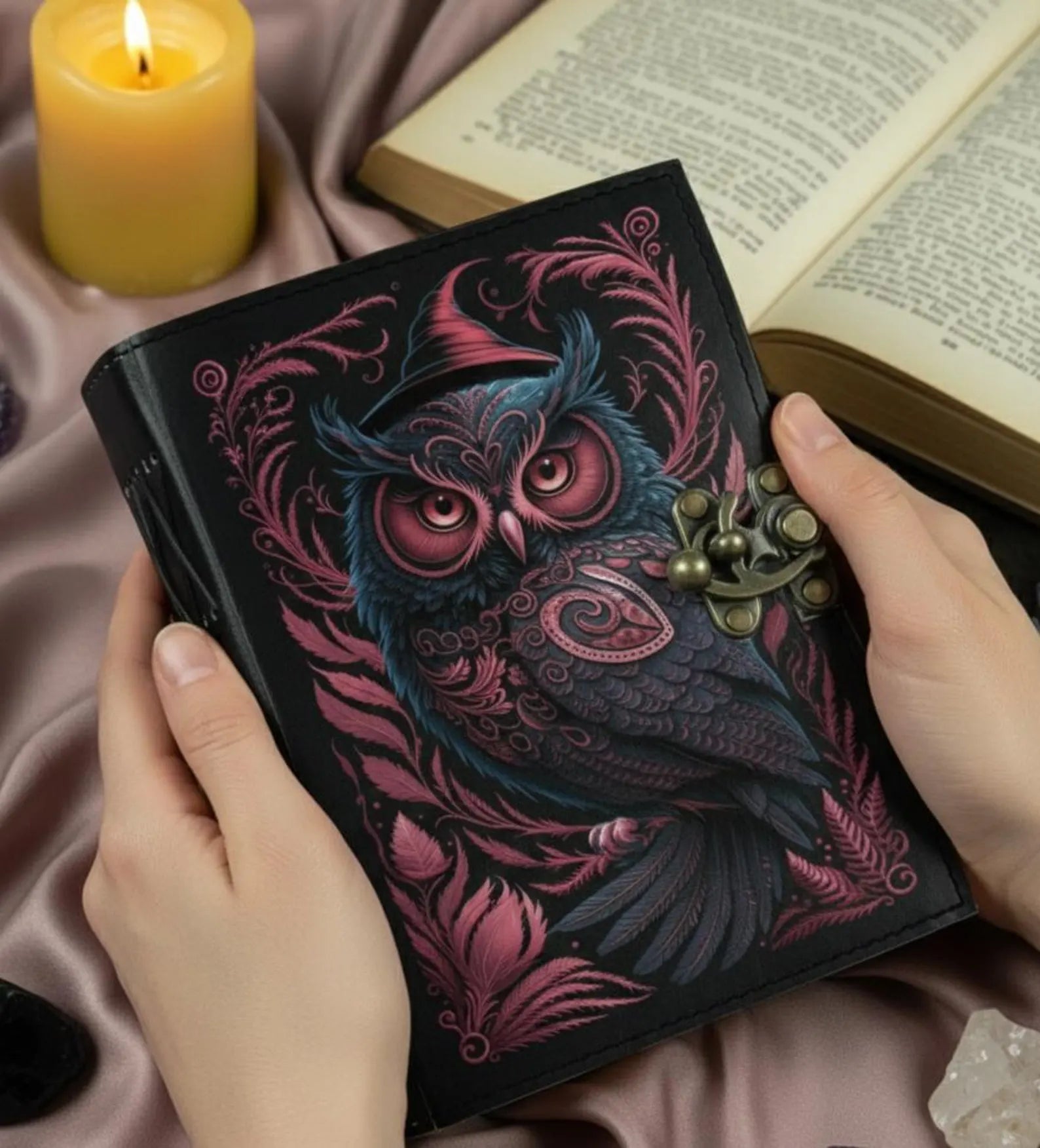 Premium Full-Grain Leather Cover – Durable, handcrafted leather with an engraved mystical owl.