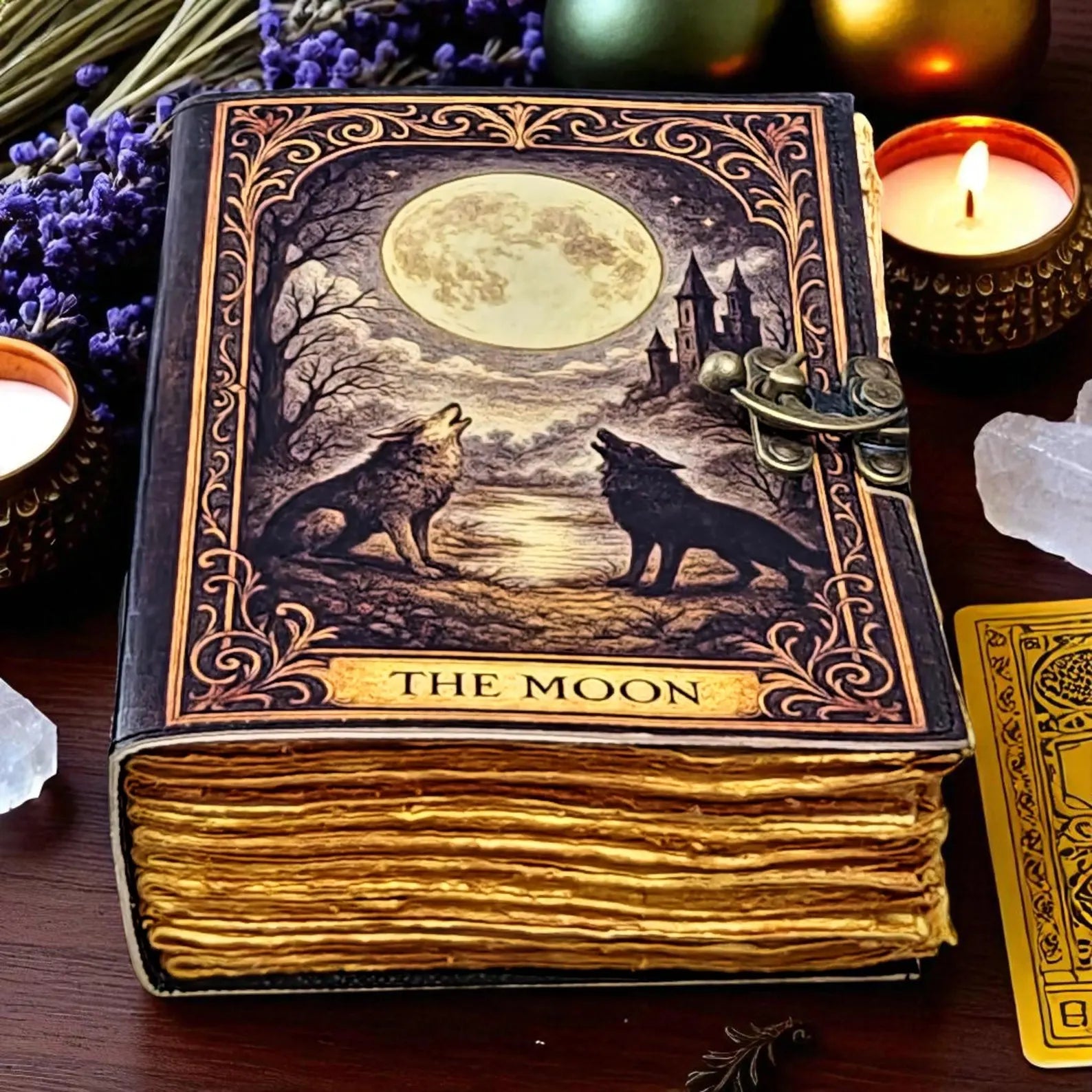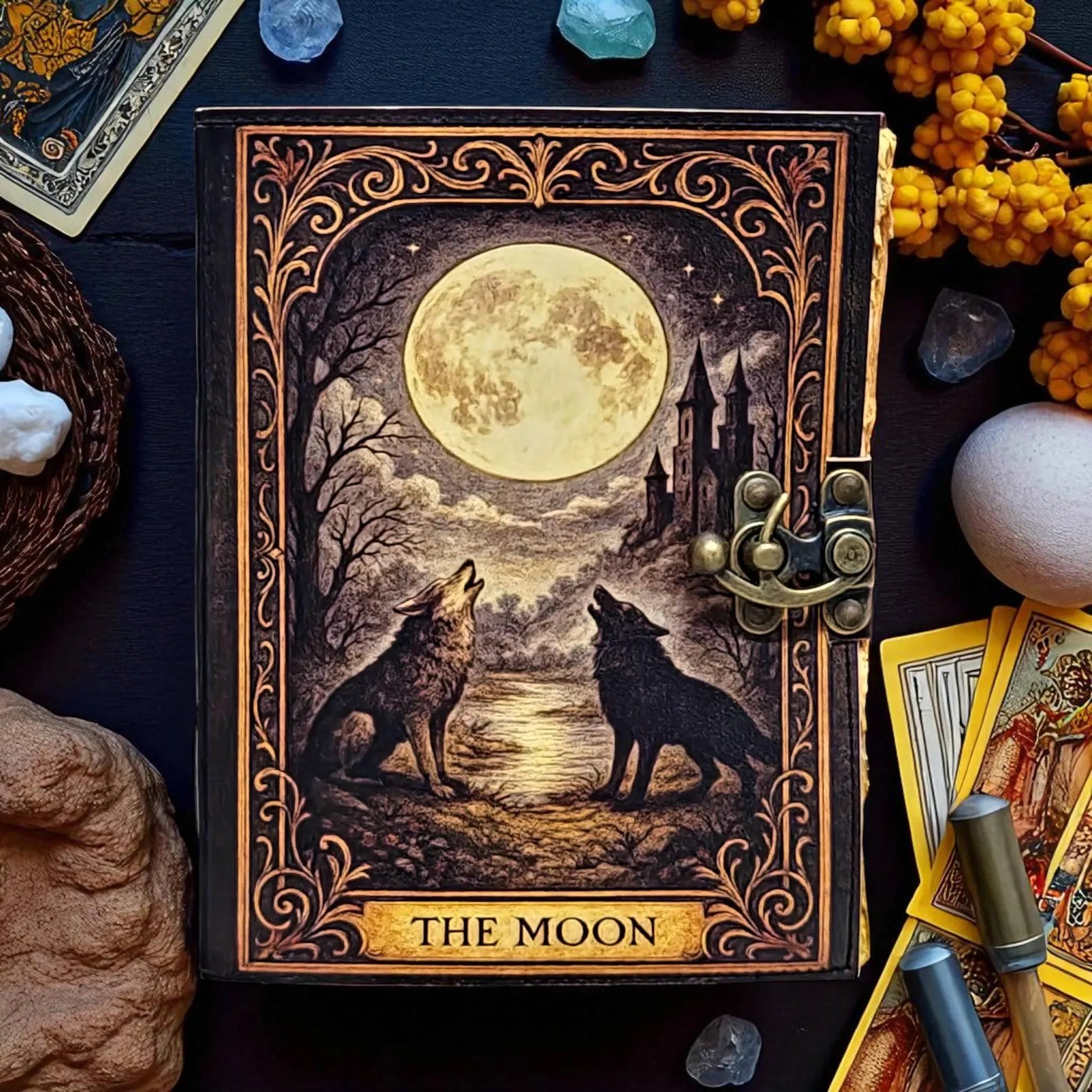 Leather Journal The Moon | Wolf Journal with Lock, Vintage Handmade Notebook, Tarot Journal, Witchy Sketchbook, Moon Phase Diary