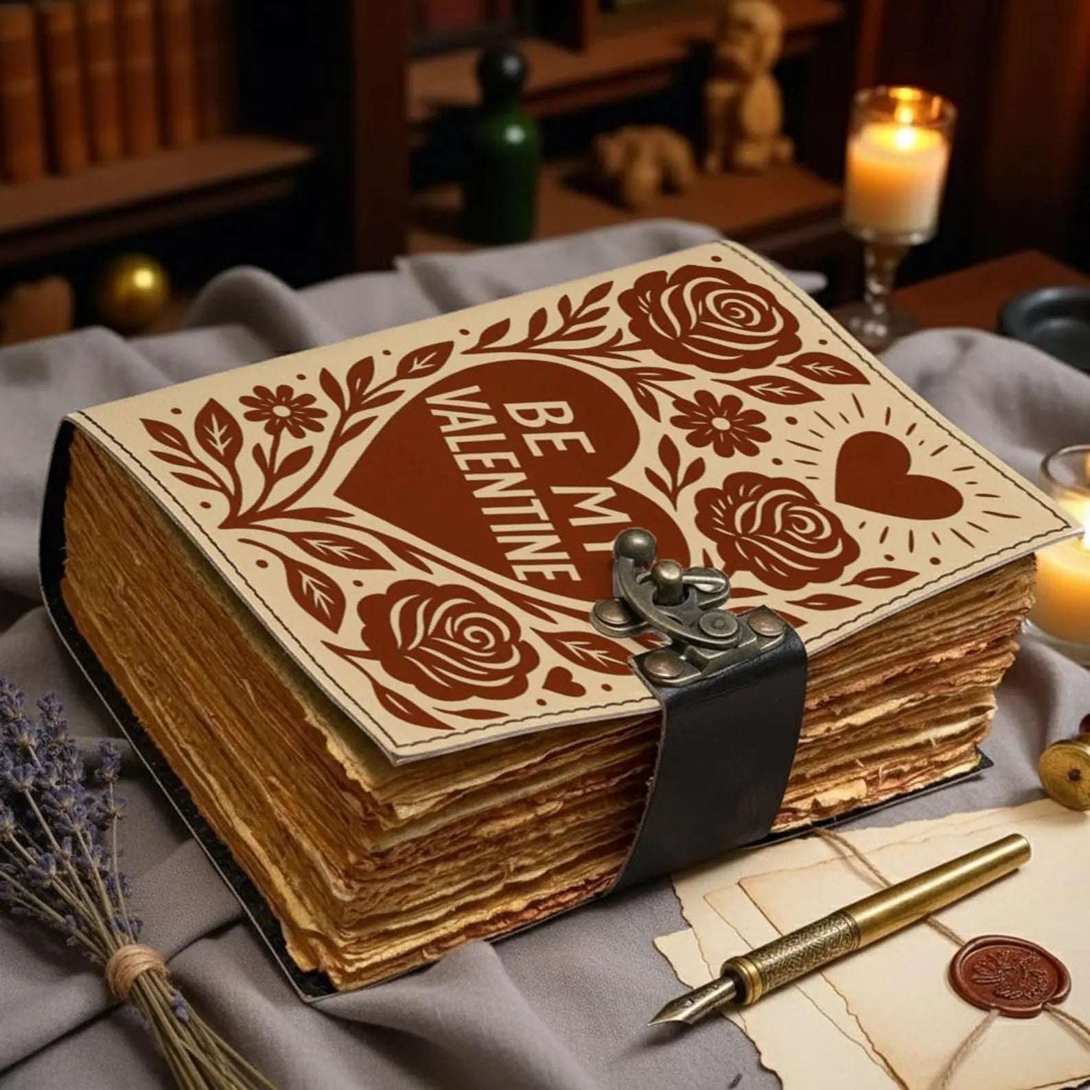 LOVE Leather Journal – Handmade Romantic Notebook with Lock, Vintage Deckle Edge Paper, Floral Heart Diary, Valentine Anniversary Gift