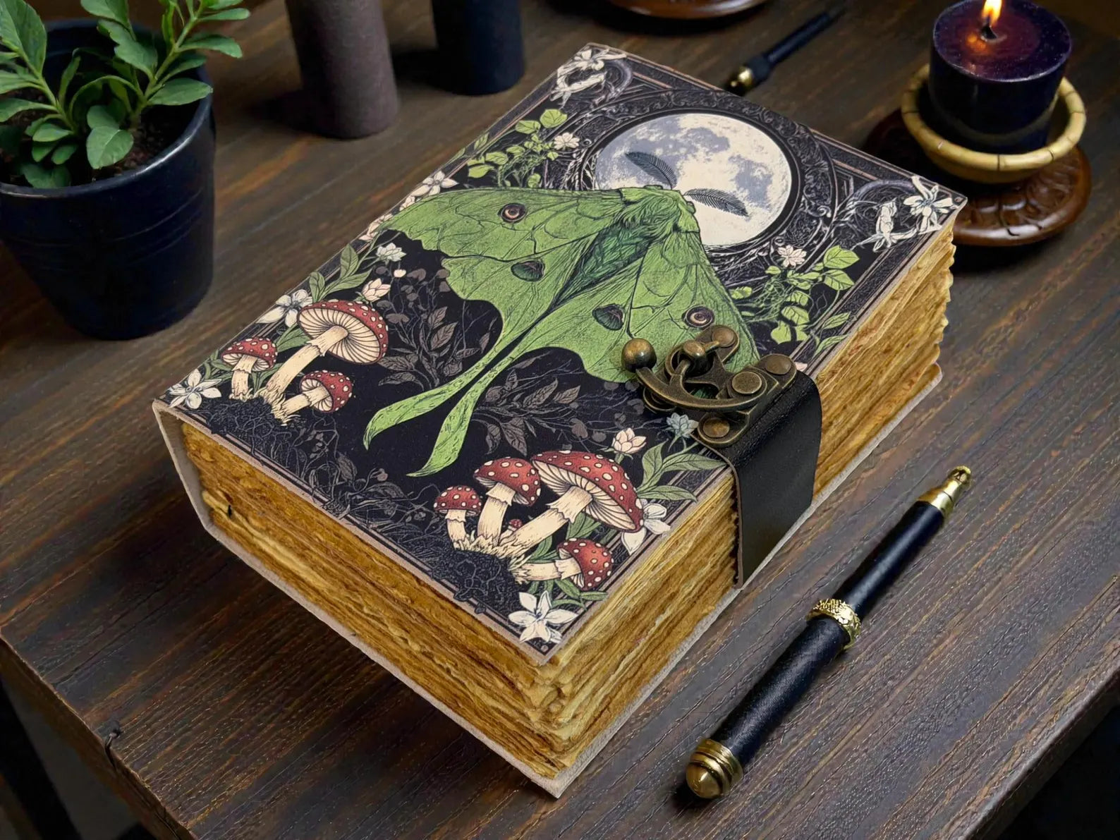 Featuring a UV-printed Mushroom & Luna Moth design on genuine leather, secured with a vintage brass lock, and filled with handmade deckle-edge pages, this journal is both a functional spell book and a magical keepsake.