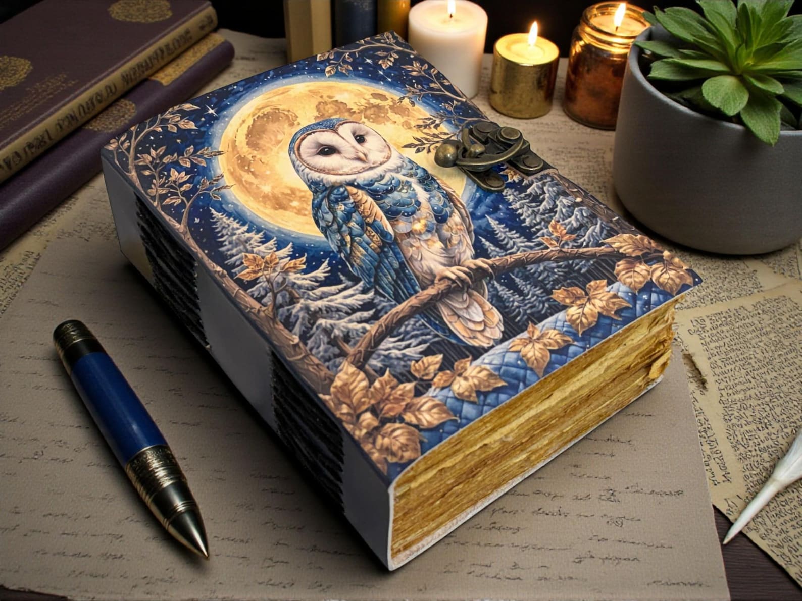 Owl Moon Vintage Leather Journal Grimoire Gift– Witchy magic Notebook, Gothic Writing Journal,