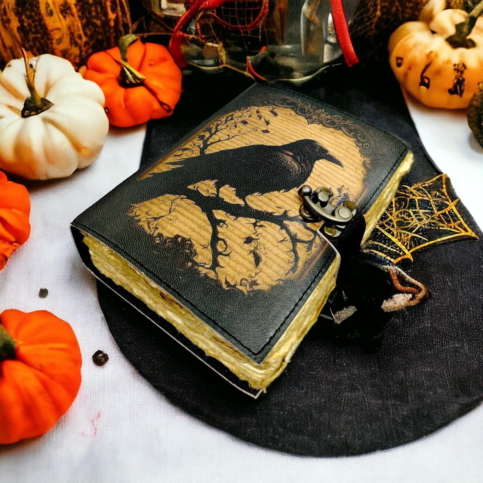 Raven Handmade Leather Journal: Vintage Spell Book, Deckle Edge Paper Witchcraft Spellbook, Wiccan Pagan Gothic Diary, Gift for Her